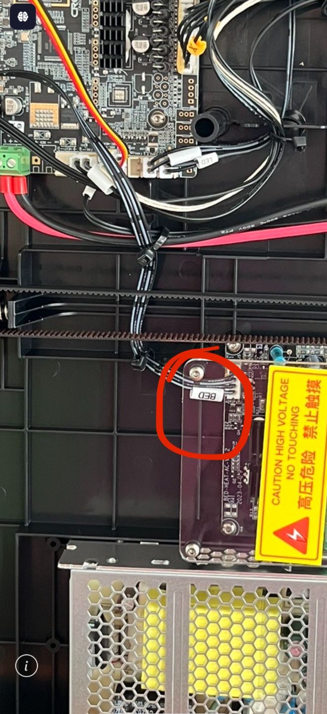 ลองเช็คชุดสายทำความร้อนของฐานพิมพ์จะอยู่ใต้เครื่อง เช็คข้อต่อทั้งสองฝั่งทั้งเมนบอร์และที่วงไว้