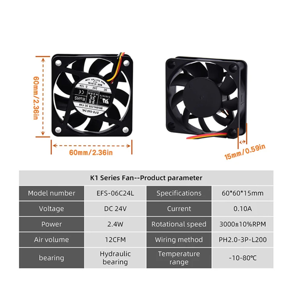 Brand : Creality Model : EFS-06C24L Size : 60*60*15mm Speed : 3000rpm +-10% Power : 24V 0.1A / 2.4W Air Volum : 12CFM Connector : PH2.0 3pin Cable Length : 200mm Bearing : Hydraulic Bearing Temperature range : -10-80C ![]() ![]() ![]() ![]() |
