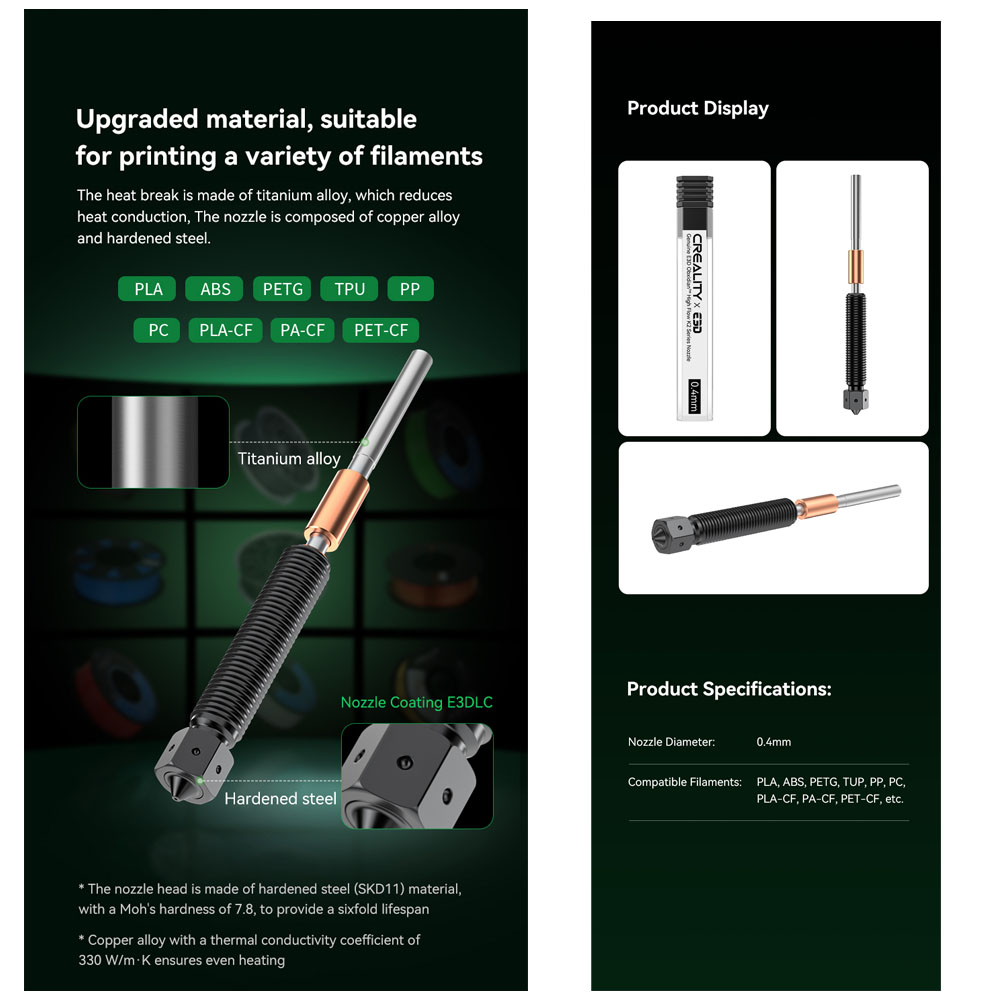 Upgraded Material Brand : Creality Genuine E3D Obxidian Nozzle Size : 0.4mm compatible : K1 Se / K1C / K1 Max / Ender3 V3 / Ender3 V3 Plus ![]() ![]() ![]() ![]() ![]() ![]() |
